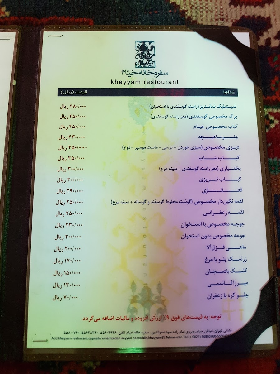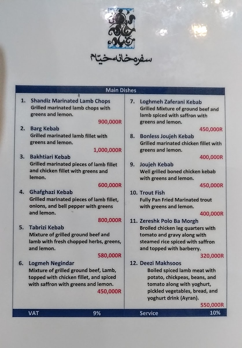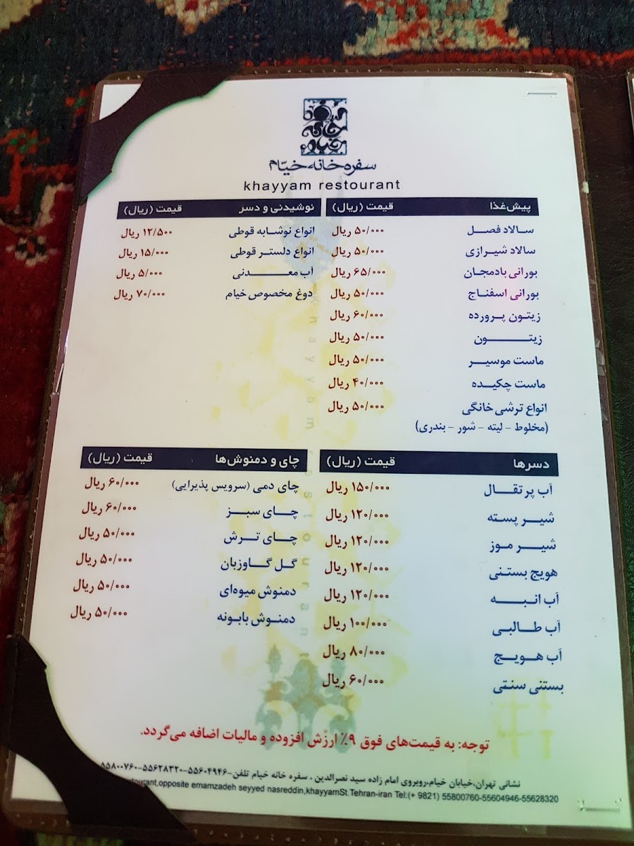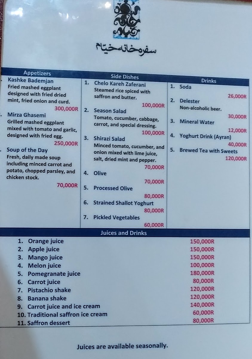 Whether you're in the mood for a hearty meal or a refreshing drink, Khayyam Traditional Restaurant’s menu delivers an authentic and satisfying dining experience that perfectly encapsulates the flavors and hospitality of Iran.